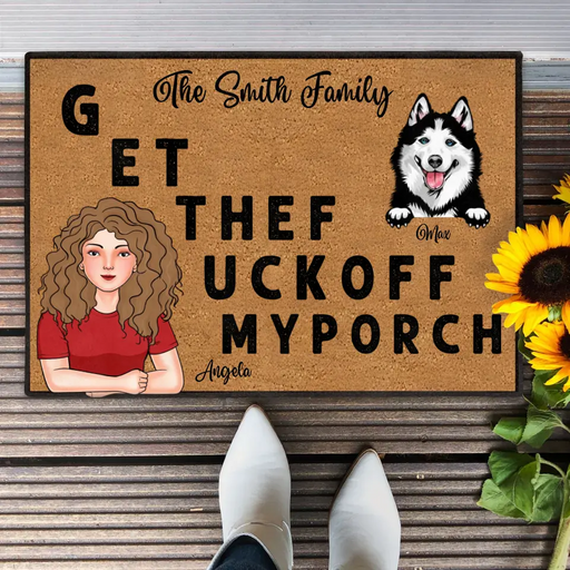 View full detailsPersonalized Pet Doormat - Gift Idea For Mother's Day/Father's Day/Pet Lovers - Adult/Couple With Up to 3 Cats/Dogs - G ET THEF UCKOFF MY PORCH