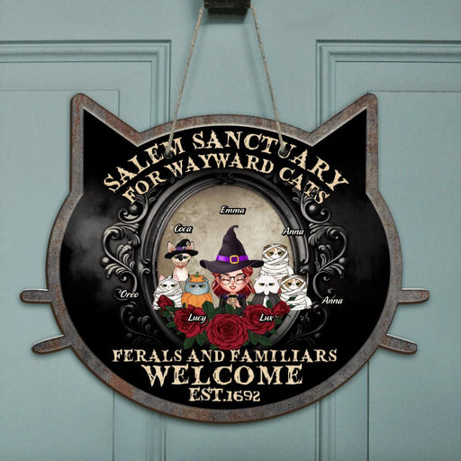 View full detailsPersonalized Halloween Cat Mom Door Sign - Up to 6 Cats - Halloween Gift For Cat Lovers/Wiccan Decor/Pagan Decor - Salem Sanctuary For Wayward Cats