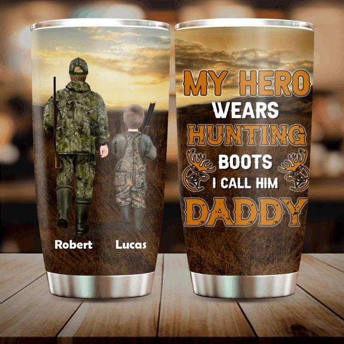 Personalized Father And Son/Daughter Hunting Tumbler - Gift Idea For Father's Day/Hunting Lover - My Hero Wears Hunting Boots I Call Him Daddy