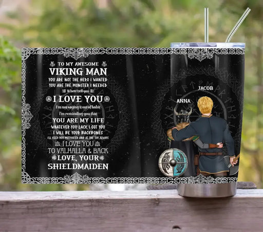 Personalized Viking Couple Tumbler - Gift Idea For Couple/Him/Valentine's Day - To My Awesome Viking Man I love You To Valhalla & Back
